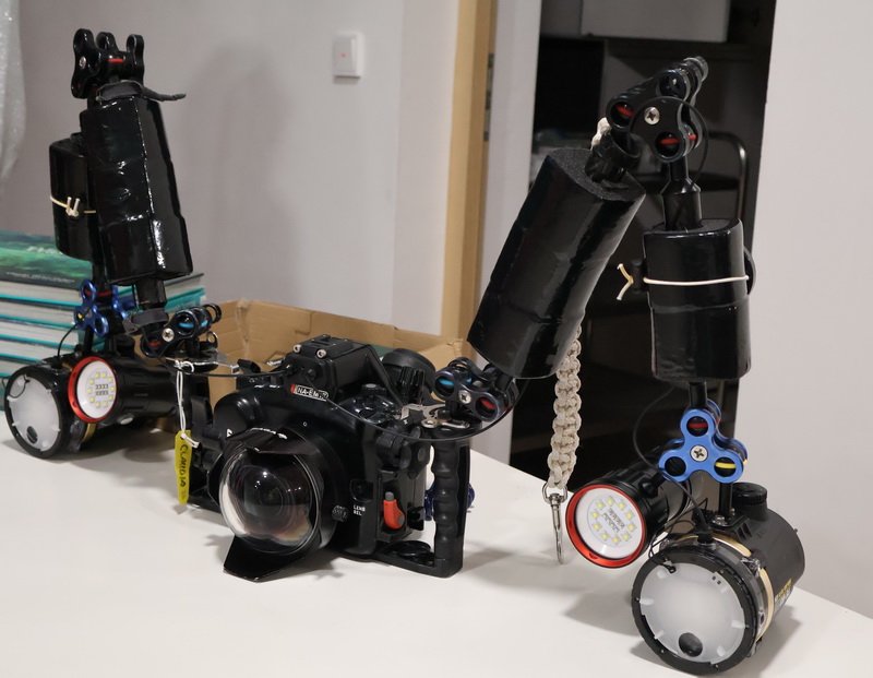 Wie gelingen solch spektakuläre Aufnahmen im Meer? „Um unter Wasser Aufnahmen machen zu können, muss man Licht mitnehmen“, verrät die Fotografin. Sie hat ihre Spezialausrüstung an diesem Abend mitgebracht und erläutert Blitzarme, Objektive und Kameras.
